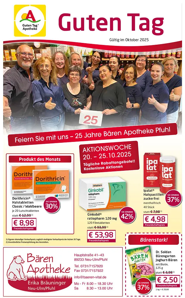 Bären-Apotheke Hauptstr. 41 -43 89233 Neu-Ulm | Öffnungszeiten Mo - Fr: 8.00 - 18.30 Uhr Sa: 8.30 - 13.00 Uhr | +49 (0) 731 7157920 |
